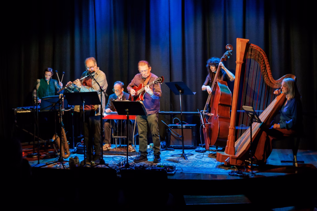 Shining with an unmistakable power and deep beauty, the unique instrumentation of horns, harp, guitar, pedal steel, contrabass, and vibes speaks in a compelling ensemble voice, while the soloists deliver a virtuosic exploration through intelligent arrangements and new composition.